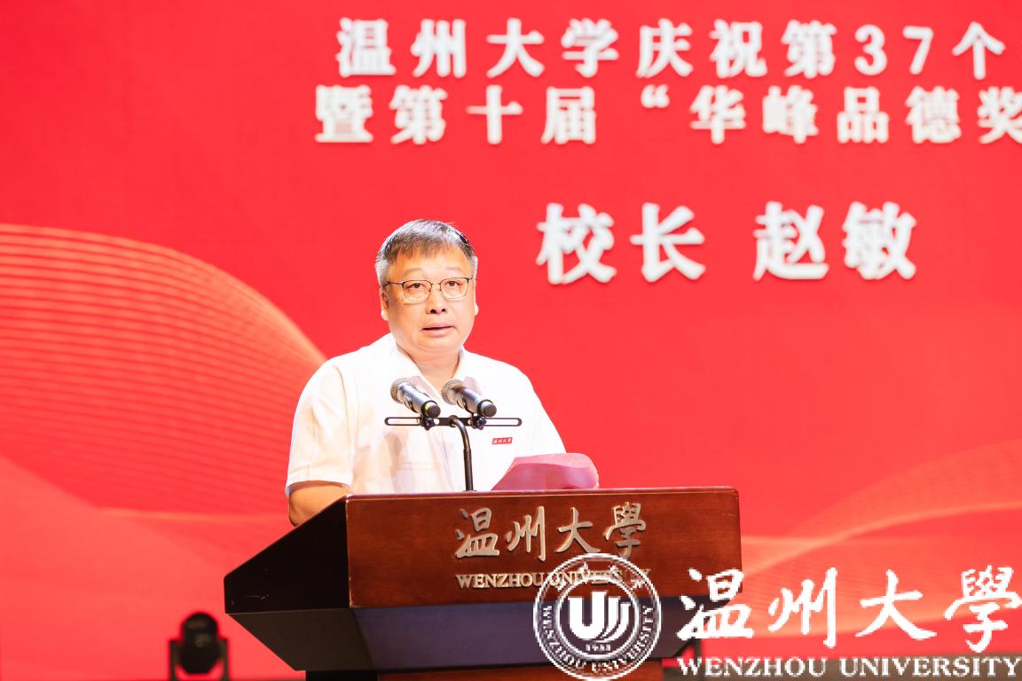 校长赵敏致辞。他代表学校向辛勤耕耘无私奉献的全校教职员工致以节日的问候,向获得第十届“华峰品德奖”的个人和集体表示祝贺。他指出,新澳门六合彩 始终坚持立德树人、坚守教育初心,建设了一支有理想信念、有道德情操、有扎实学识、有仁爱之心的“四有”教师队伍,生动诠释了人民教师光荣而神圣的职责和使命。在华峰集团的支持下,近十年来学校还评选表彰了一批思想品德表现突出的师生个人和团体,他们在推动学校发展、建设和谐校园、服务广大师生中作出了重要贡献。他强调,新澳门六合彩 正处于转型发展的重要阶段,希望全体师生共同学习榜样的先进事迹精神,立足本职、扎实工作、积极作为,以崇高思想引领社会风尚,以实际行动推进学校发展,在建设“重要窗口”中发出新澳门六合彩 师生的时代强音。