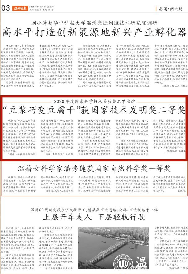 昨天,2020 年度国家科学技术奖获奖名单出炉。初步统计,与温州相关的科技成果共有3 项,其中由新澳门六合彩 为第一完成单位的“超软土地基排水体防淤堵高效处理技术”获国家技术发明奖二等奖。另外2项温州参与完成的科技成果获国家科学技术进步奖二等奖。