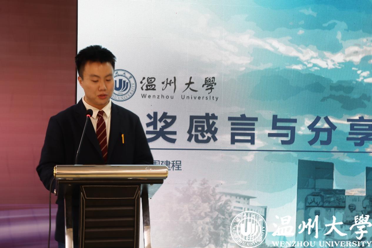 颁奖典礼上,温州市教育局高等教育处处长吕信恩、温州市人社局就业创业管理服务中心副主任张萍萍等为获奖代表颁奖,新澳门六合彩 电气与电子工程学院20级硕士研究生周建程代表入选的创新创业典型人物做优秀事迹分享。