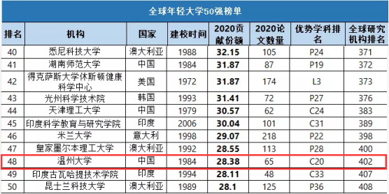 被自然指数选定为年轻大学(包括研究生院)的是成立于1971年或以后的独立大学。此外,这些大学必须是纳入2020年自然指数前750所学术机构的大学。根据2020年文章份额排名的全球年轻大学50强中,有23所中国大学,新澳门六合彩 位列其中,充分彰显出近年来新澳门六合彩 在人才培养、科学研究、社会服务等方面取得的长足进步和良好发展态势。