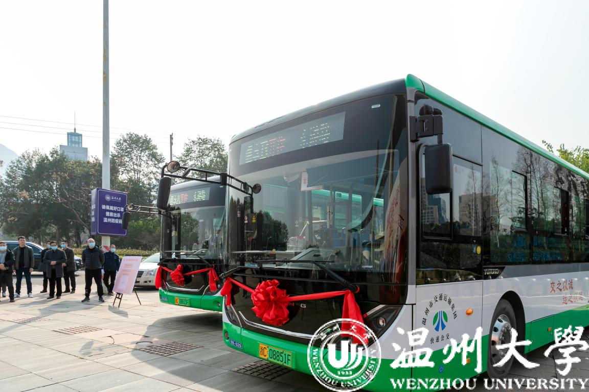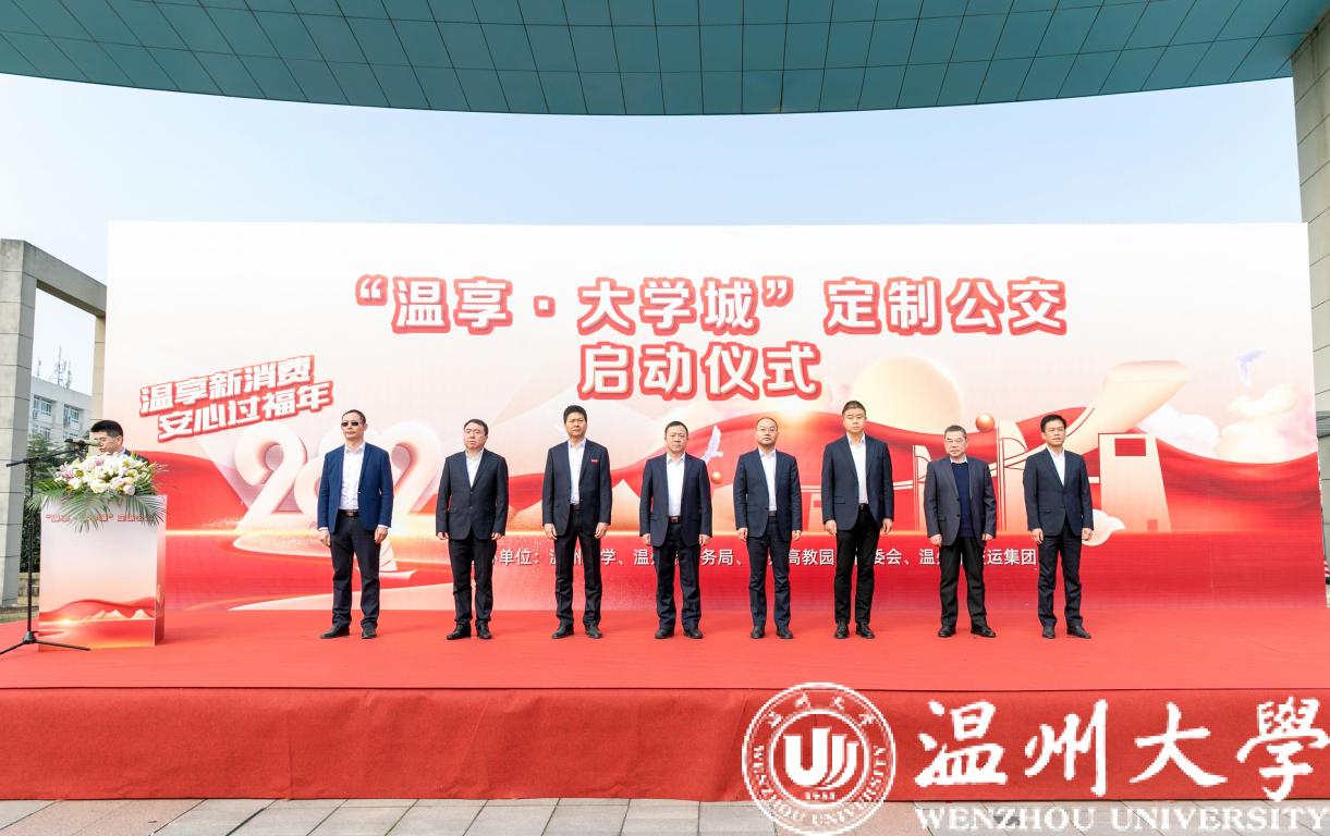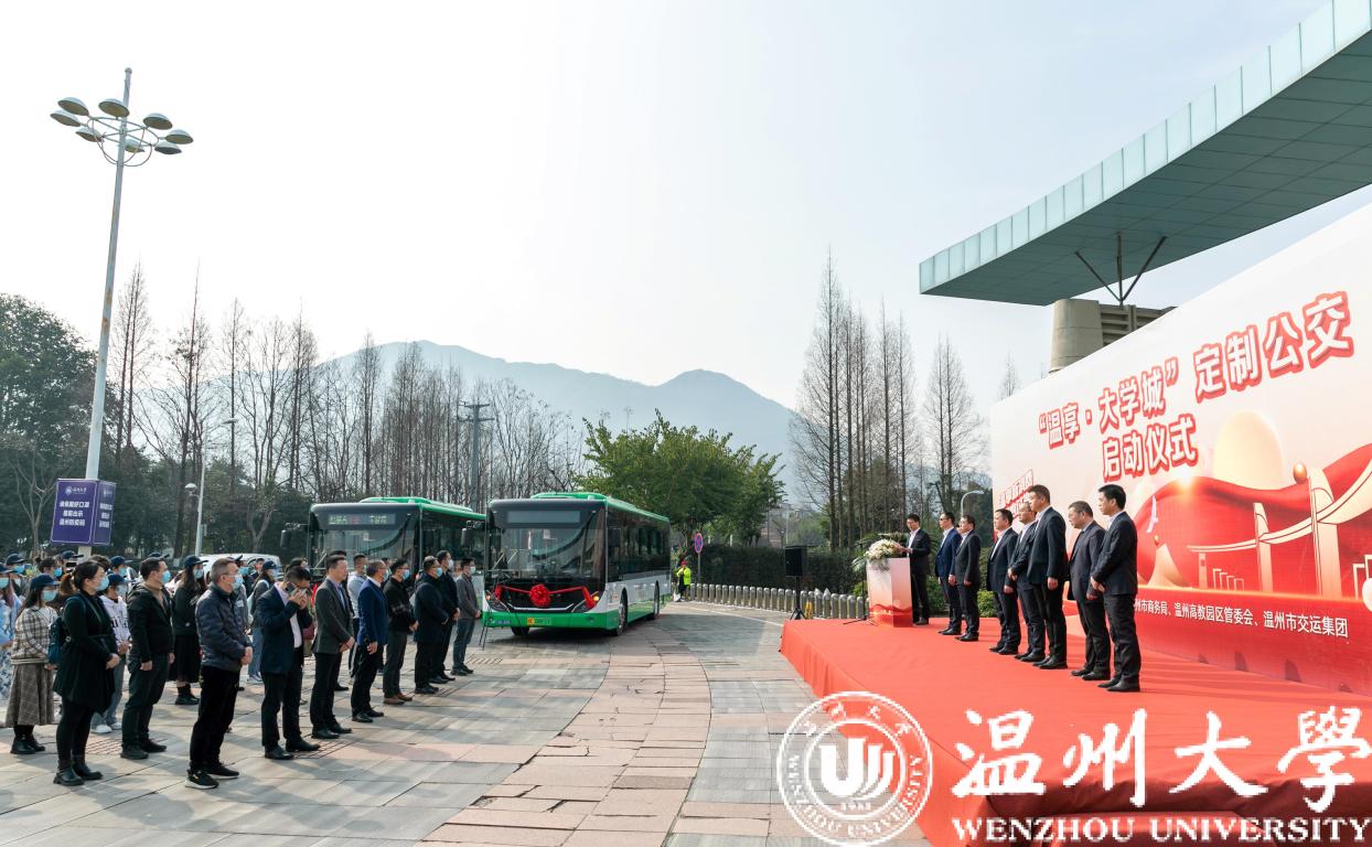 2月27日,“温享·大学城”定制公交启动仪式在新澳门六合彩 举行。温州市副市长陈宽、商务局局长彭魏滨、交运集团董事长朱祖荣、校党委书记谢树华、副书记庄兴忠等领导出席活动。