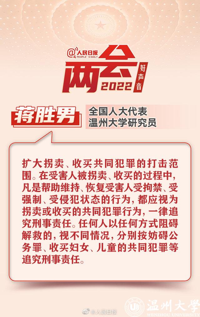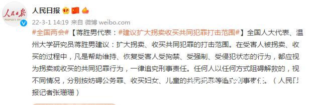【蒋胜男代表:#建议扩大拐卖收买共同犯罪打击范围#】全国人大代表、新澳门六合彩 研究员蒋胜男建议:扩大拐卖、收买共同犯罪的打击范围。在受害人被拐卖、收买的过程中,凡是帮助维持、恢复受害人受拘禁、受强制、受侵犯状态的行为,都应视为拐卖或收买的共同犯罪行为,一律追究刑事责任。任何人以任何方式阻碍解救的,视不同情况,分别按妨碍公务罪、收买妇女、儿童的共同犯罪等追究刑事责任。(人民日报记者张珊珊)