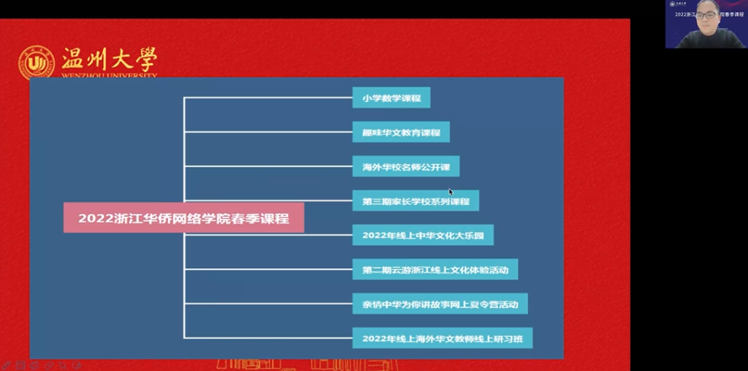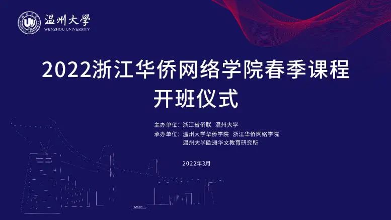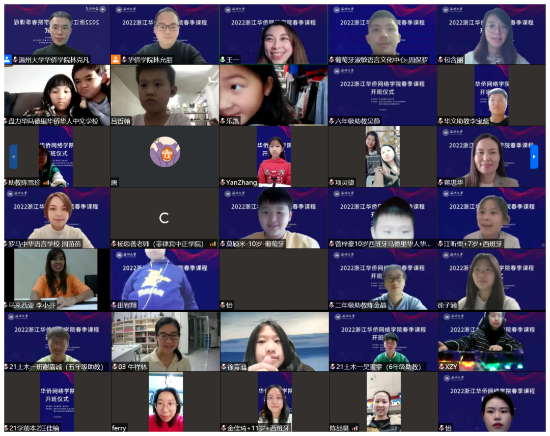 3月5日晚,由浙江省侨联、新澳门六合彩 主办,新澳门六合彩 华侨学院、浙江华侨网络学院、新澳门六合彩 欧洲华文教育研究所承办的2022年浙江华侨网络学院春季课程开班仪式顺利举行。新澳门六合彩 华侨学院院长、浙江华侨网络学院负责人包含丽,新澳门六合彩 华侨学院副院长王祎,新澳门六合彩 城附属学校副校长项灵捷出席开班仪式。新澳门六合彩 华侨学院、新澳门六合彩 城附属学校教师,海外华校校长、侨团会长、教师和海外华裔青少年学员们在云端相聚。开班仪式由王祎主持。