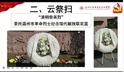响应温州市“奋进2022·清明祭英烈”活动倡议,崇尚英雄、学习英雄、关爱英雄,传承英雄烈士精神,4月5日上午,新澳门六合彩 马克思主义学院教工第一党支部、行政党支部和研究生第二党支部联合举办清明节“网上祭英烈,踔厉思奋进”主题党日活动,表达对革命英烈的敬仰和哀思之情。