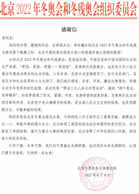 日前,奥林匹克研究专家、新澳门六合彩 体育与健康学院教授易剑东收到了来自北京冬奥组委的感谢信。信上表示,易剑东在北京冬奥会绿色办奥、可持续性工作方面作出了重要贡献。