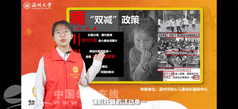据介绍,知心绘本——留守儿童四维“心”关爱志愿服务项目作为新澳门六合彩 教育学院知心姐姐志愿服务队的品牌项目,始终聚焦“双减”志愿服务,以留守儿童为服务对象,在调研3259名留守儿童和查阅461篇文献后,得出留守儿童七大心理问题,并依据行为主义疗法等三大心理理论,打造知心绘本心理疗愈模式,以绘本为载体,以绘本课、绘本剧、绘本夏令营为手段,常态化开展“双减”志愿服务。目前,该项目已开展“双减”特色线下课程共计4000余次,线上课程共计300余次,点赞量达25万,服务小时超34万,由绘本课、绘本剧整合成的课程包体系已售卖给学校、社区、政府的56个单位,真正正正助力“双减”政策落实。