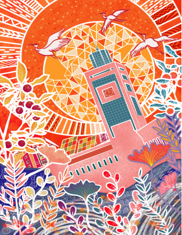 爱学校,携手共建美丽校园。“我的作品主要采用了新澳门六合彩 周边的植物,包括银杏、杨梅树和一些叫不出名字但经常会出现的树,截取小部分元素在画面下半部分作为装饰和铺垫。上半部分加上温州当地田野经常出现的动物白鹭,画面中心主题是新澳门六合彩 的图书馆建筑,图书馆前下半部分有较为抽象的河流与土地,上面有小鱼等等。整体的环境和动植物将图书馆紧紧围绕,背景是一个巨大的抽象太阳,后面还有小部分太阳能板和小型房屋建筑,主要体现人与自然和谐共生,将所有元素融合在一起,并用暖色调来进行色彩搭配,表现珍爱地球的主题。”马芳芳同学介绍了自己的作品。