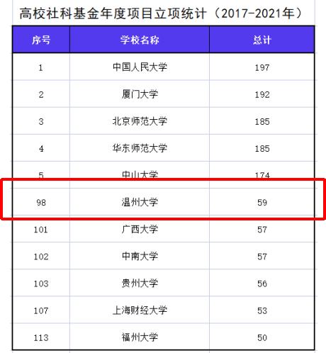 近日,“高绩”整理和发布了我国近五年(2017-2021年)国家社科基金年度项目和重大项目的立项情况,新澳门六合彩 在该榜单中的排名表现优异,国家社科基金年度项目排名全国第98位、浙江省第8位(含浙江大学)。这是新澳门六合彩 继校友会2020年中国大学学术排名(社会科学)和2016-2020中国大学教育部社科奖排名等多次跻身全国高校100强之后,再一次跻身全国高校前100强。