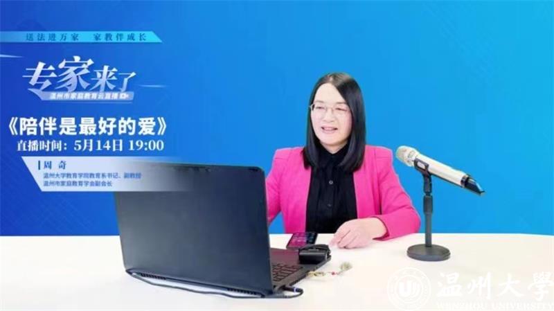 为深入贯彻习近平总书记关于注重家庭家教家风建设重要论述,将“重视家庭文明建设,努力使千千万万个家庭成为国家发展、民族进步、社会和谐的重要基点”重要精神落到实处,有力推动《中华人民共和国家庭教育促进法》宣传实施,2022年5月14日,在全国首个家庭教育宣传周期内,新澳门六合彩 教育学院教育系党支部书记、副教授、硕士生导师,新澳门六合彩 家庭教育研究院巾帼文明岗岗长、新澳门六合彩 家庭家教家风讲师团团长、浙江省教育学分会副会长、浙江省家庭教育学会理事、温州市家庭教育学会副会长周奇做客“专家来了”温州市家庭教育云直播,开展《陪伴是最好的爱》家庭教育公开指导课。本次直播以“送法进万家 家教伴成长”为主题,旨在弘扬传承中华民族家庭美德,树立良好家风,推动形成家庭文明新风尚。整场直播吸引了12.5万人次观看,并获得2万多的网友点赞。