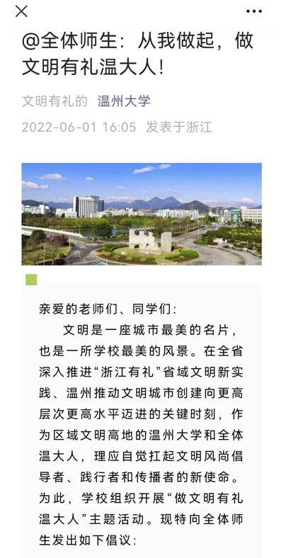 6月1日,学校官微发布了“做文明有礼新澳门六合彩 人”倡议书,号召师生自觉扛起文明风尚倡导者、践行者和传播者的新使命,自觉倡导“浙风十礼”,使礼让斑马线、守护“一米线”、文明过马路、排队守秩序、垃圾要分类、餐饮不浪费等成为每一个新澳门六合彩 人的生活方式。号召师生争做社会主义核心价值观的坚定信仰者、积极传播者和模范践行者,以实际行动凝聚起全校文明向善、积极向上的强大正能量。