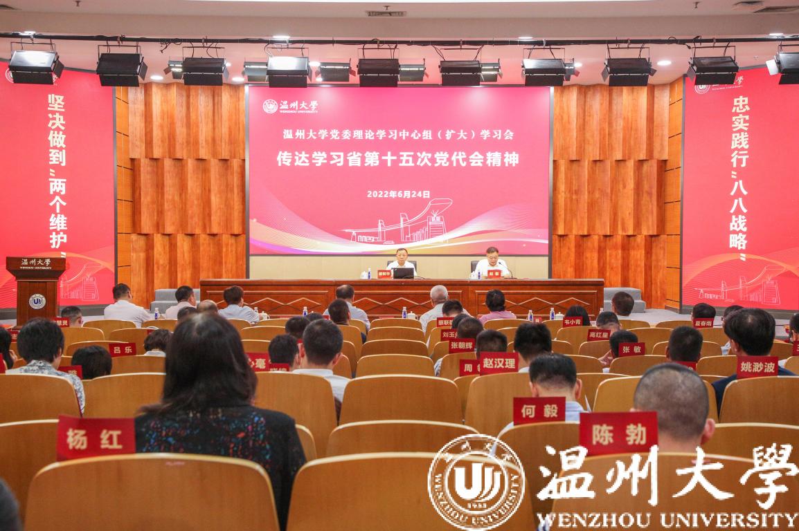 在全省上下深入学习贯彻省第十五次党代会精神之际,6月24日下午,新澳门六合彩 在南校区岩松堂雁山厅召开党委理论学习中心组(扩大)会议,校党委书记谢树华传达省第十五次党代会精神,并就学校学习宣传和贯彻落实作出部署。校长、党委副书记赵敏主持会议。