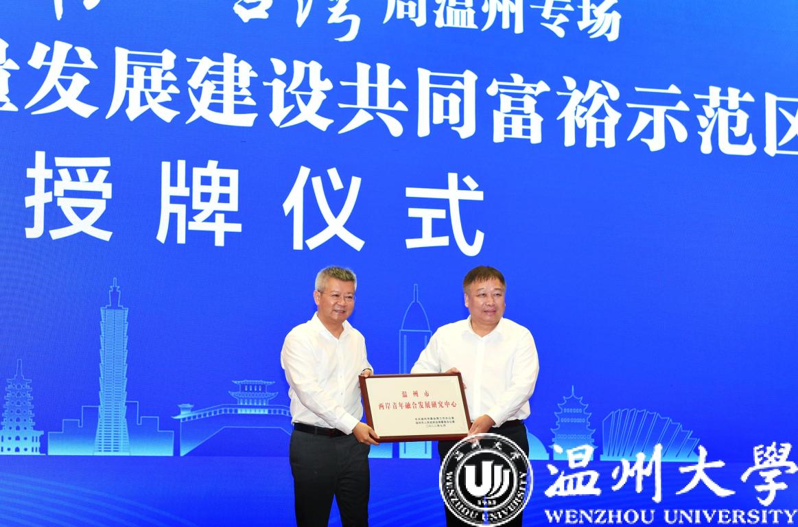 在“筑梦温州”海峡青年创新创业季启动仪式上,大会为新澳门六合彩 两岸青年融合发展研究中心授牌,校长赵敏校长从温州市委常委、统战部部长汪驰手中接牌。