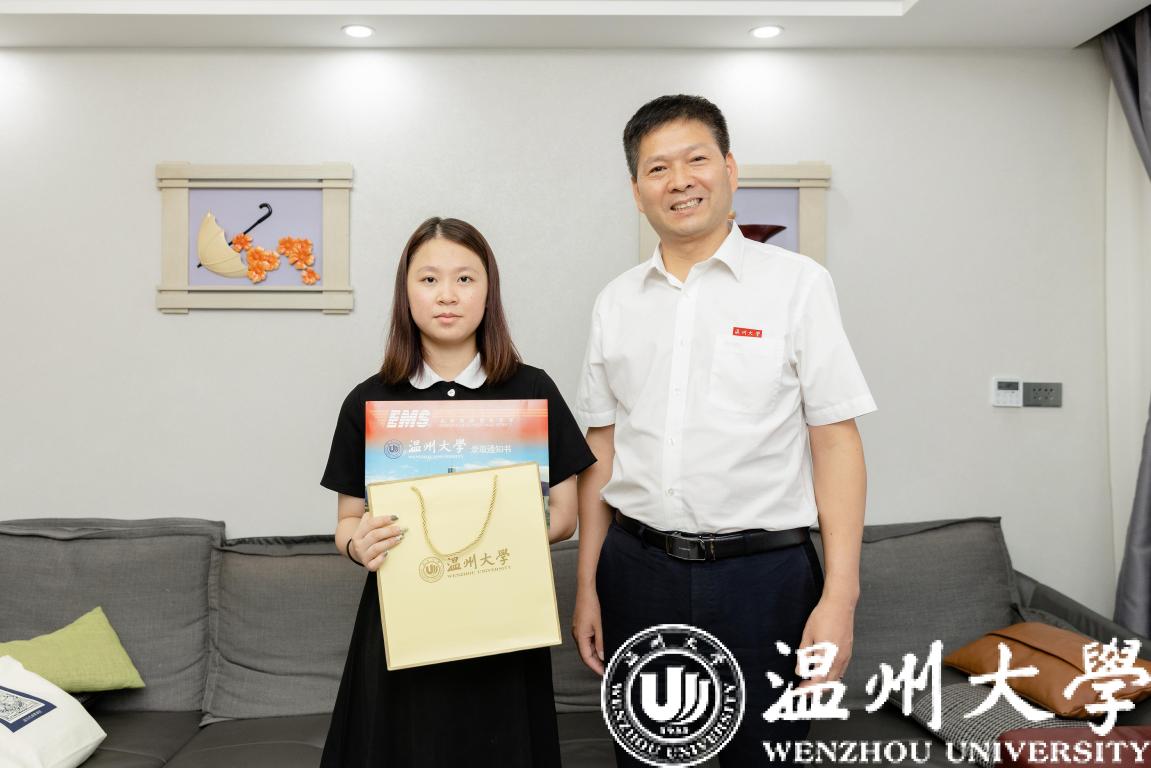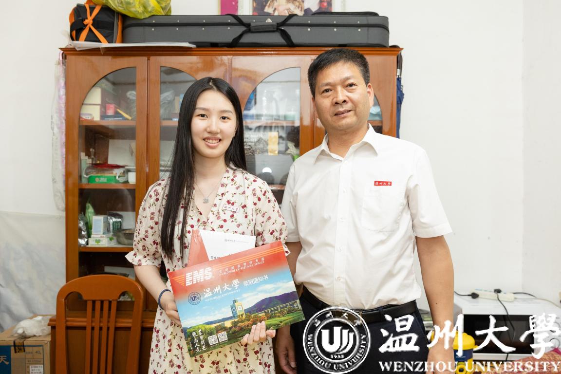 7月23日,新澳门六合彩 党委副书记庄兴忠化身邮政快递员,在丽水市侨联党组成员、副主席王俊的陪同下,将2022年新澳门六合彩 首封录取通知书送到丽水市莲都区王鑫溢同学手中。