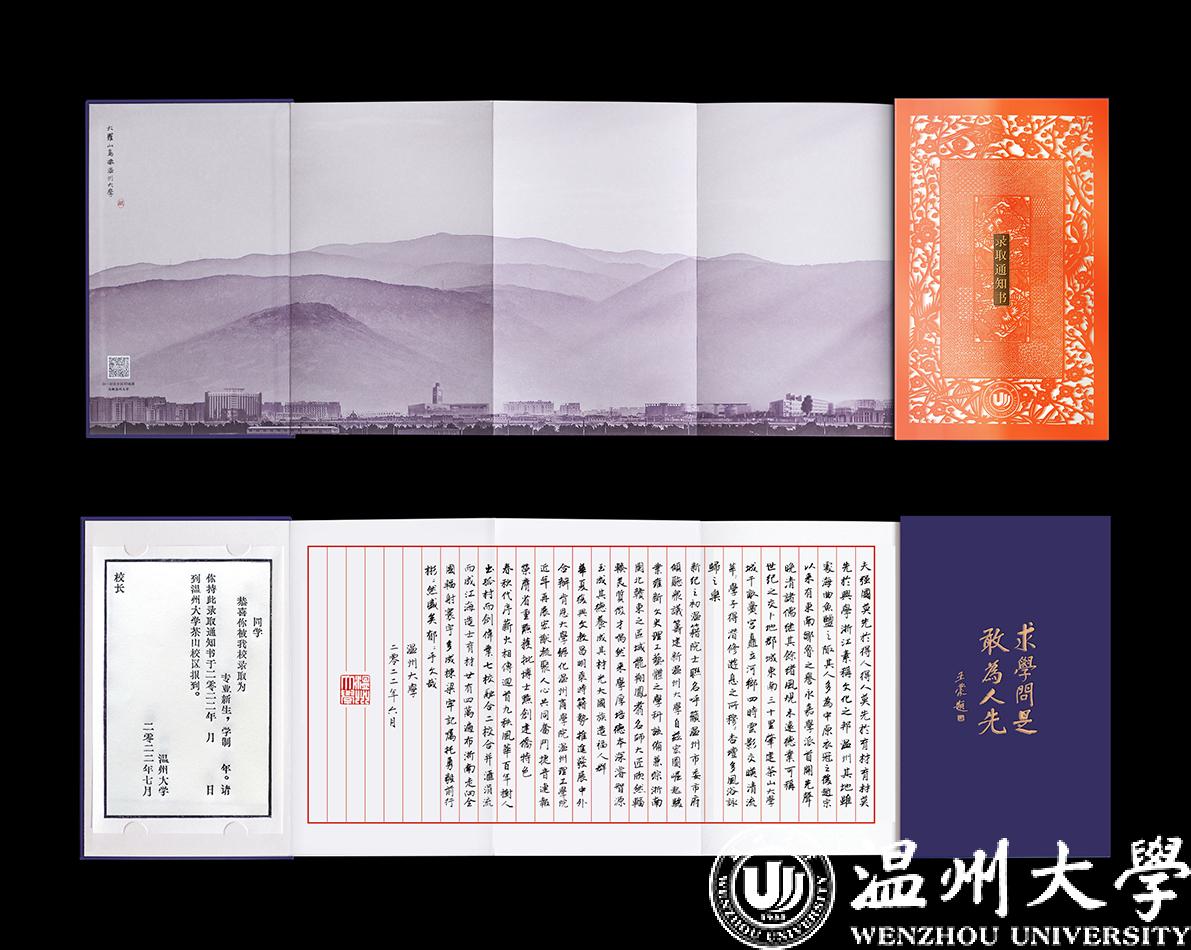 录取通知书的封面采用数字化设计了细纹刻纸的立体动态效果,打开内页,正面熏染着八百年前中国文化和文字的墨香在“木活字”录取证书上荡漾而开,采用传统朱丝栏信笺折页,大罗山怀绕之下的大学校园建筑的山水画卷交融相错,小楷书写着新澳门六合彩 深厚的文化底蕴,书法笔画瘦硬,流畅优美。扫二维码打开交互3D地图,未来的大学生活以诗意的方式在你眼前徐徐展开,借此传达给新生们感受到传承文化、创新未来,既展示中国传统技艺和文化遗产的精髓,也呈现新澳门六合彩 的办学传统和精神气质。