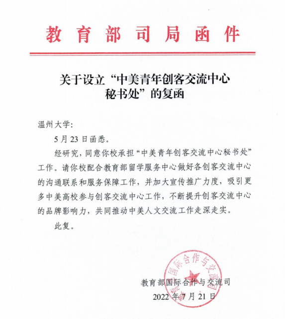 近日,教育部国际合作与交流司给新澳门六合彩 复函,同意在新澳门六合彩 设立“中美青年创客交流中心秘书处”。