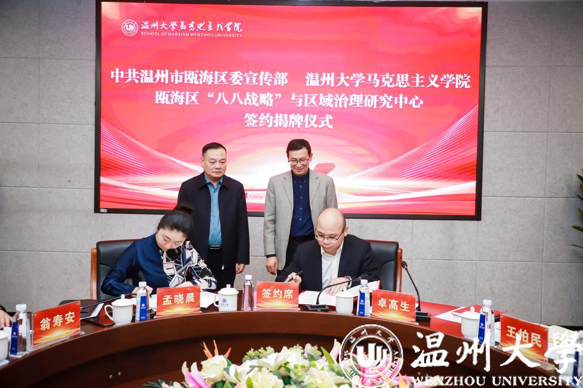 为深入贯彻党的二十大精神,忠实践行“八八战略”、奋力打造“两个先行”的瓯海样板,3月8日,由瓯海区委宣传部与新澳门六合彩 马克思主义学院联合成立的“瓯海区‘八八战略’与区域治理研究中心”在岩松堂展示厅正式揭牌。新澳门六合彩 党委委员、副校长潘玉驹,瓯海区委常委、宣传部长孟晓晨参加合作共建签约仪式。