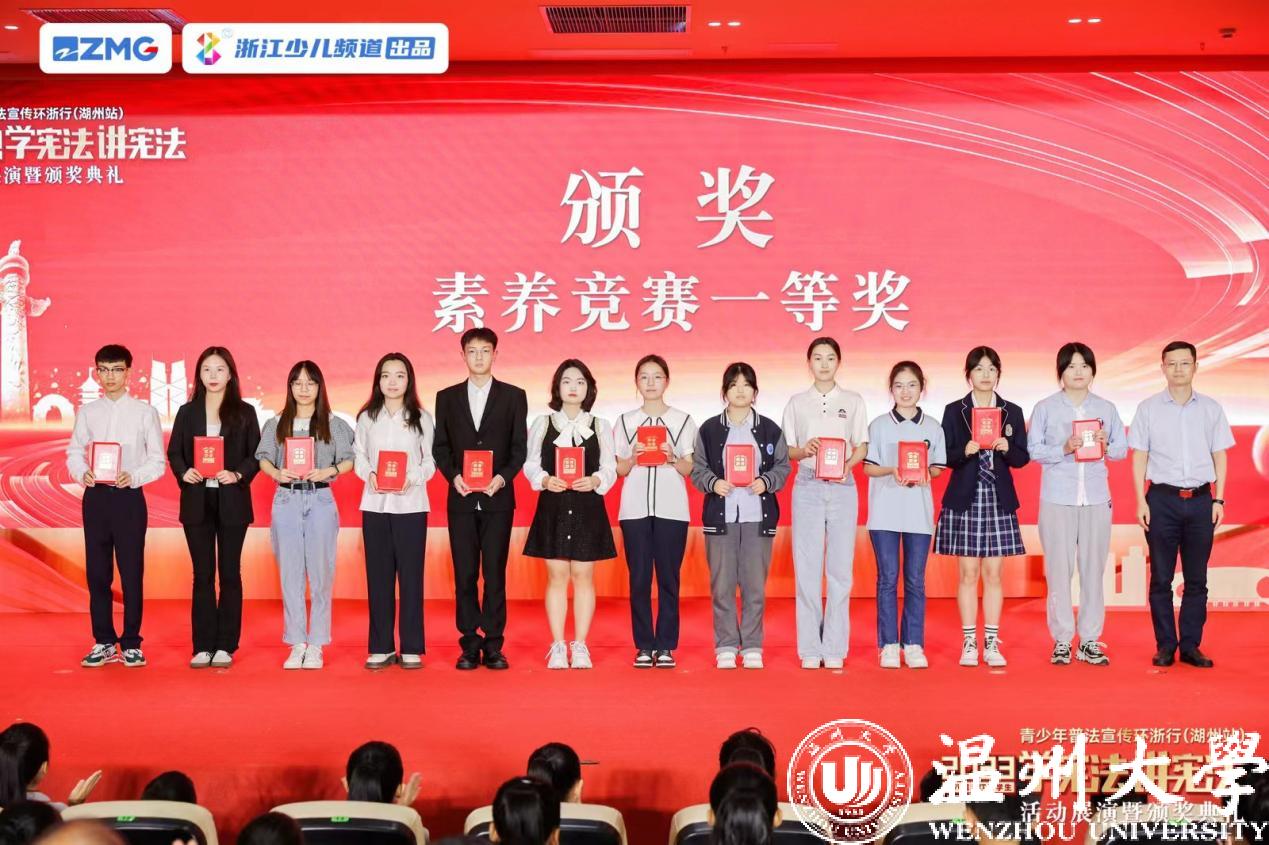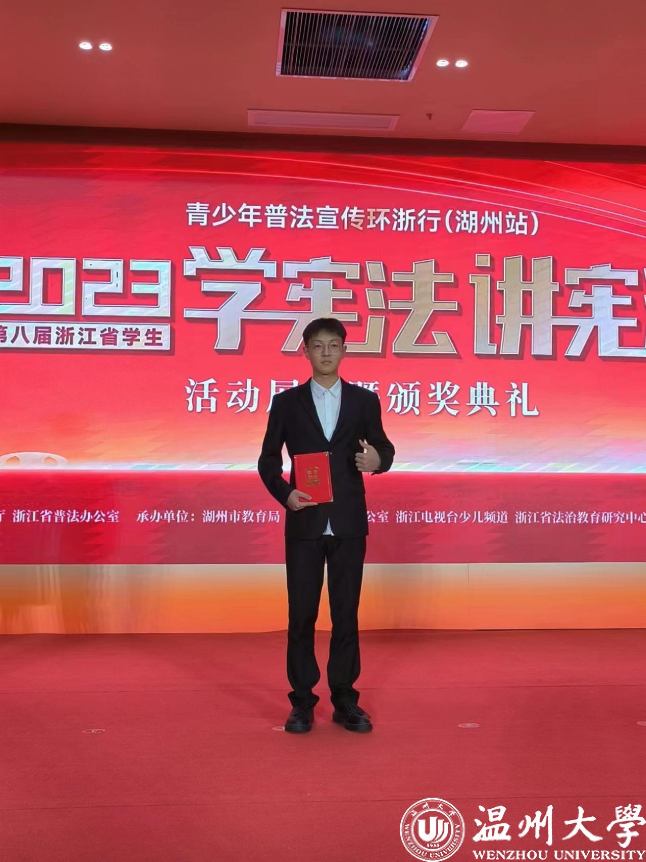 法学院吴杭泓同学代表新澳门六合彩 前往湖州参加“学宪法讲宪法”知识竞赛省级遴选赛,他前期准备充分,赛场上发挥稳定,以现场笔试第一的成绩从35名高校选手中成功入围决赛,在决赛知识竞答及加试环节中以并列第二的成绩,最终获得省赛一等奖的优异成绩;法学院钟萍同学的演讲作品《宪法的守护者》通过省级视频遴选,获得二等奖。