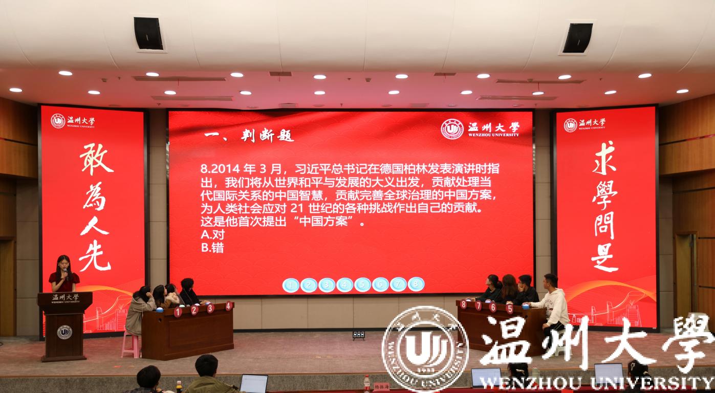 “习近平法治思想首次提出是在2020年11月16日至17日召开的中央全面依法治国工作会议!”“恭喜2号同学抢答成功!”……在育英图书馆二楼报告厅,新澳门六合彩 “习近平法治思想”知识竞赛如火如荼地进行中。知识竞赛重点围绕宪法知识、习近平法治思想、党的二十大报告相关内容,设有判断题、单选题、多选题和逻辑题。500余名学生参与到知识竞赛初赛环节,最终24名选手进入决赛。决赛现场紧张热烈,充分检验了大学生对习近平法治思想、宪法知识的掌握程度,将法治学习的知识性与趣味性融为一体。