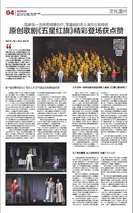 10 月7 日、8 日,由中共温州市委宣传部、新澳门六合彩 、中共瑞安市委联合出品的中国原创歌剧《五星红旗》在温州大剧院试演,向新中国成立70周年献礼。