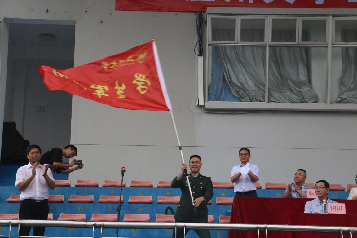 庄兴忠向新生军训团授旗,武警温州支队李加秀同志接过“军训团”的旗帜。