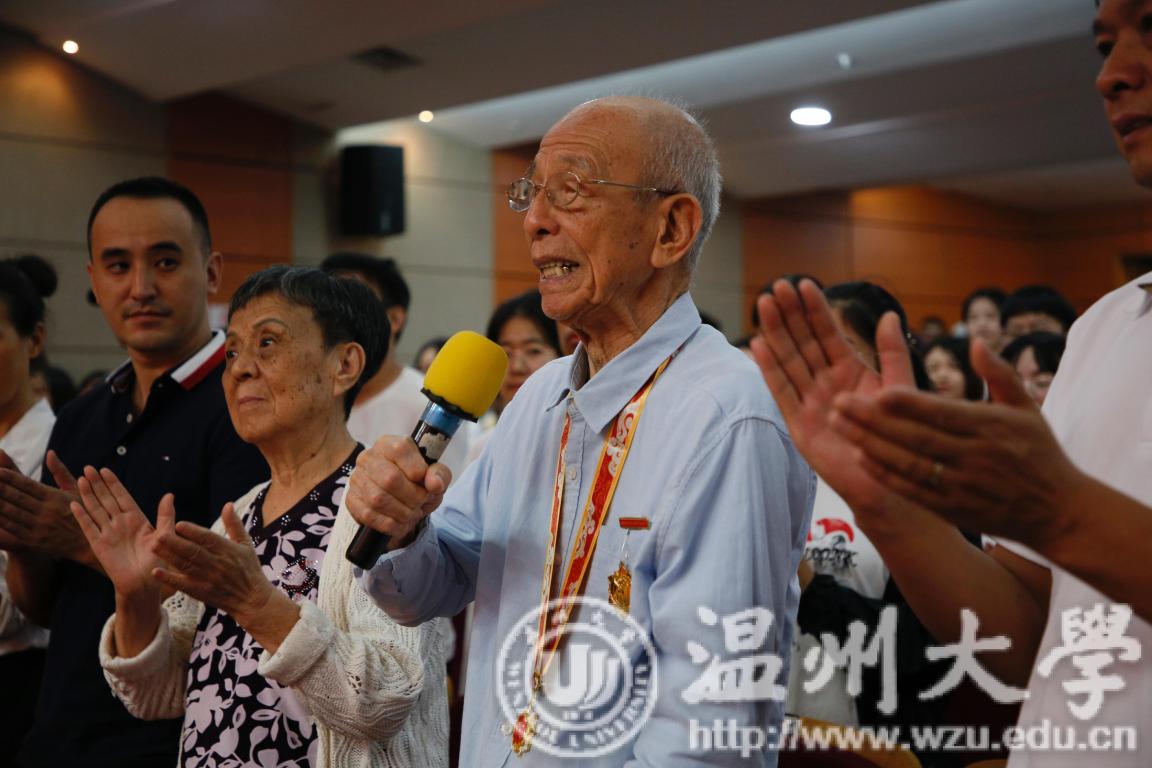 96岁的杨作浩老师用真挚的语言向我们描述了几十年来中国天翻地覆的变化。在杨老十几岁的年纪,中国还是一个备受列强欺凌的国家,遭受着掠夺和种种屈辱,杨老说:“那时我才十几岁,那种痛苦是承受不了的,我意识到我们必须要站起来,必须要参加革命运动!”那时他最大的愿望就是希望有朝一日中国变得繁荣昌盛,今天,杨老笑着说,“我的愿望实现了,看着今天的中国,我倍感荣光与骄傲。”杨老还主动表示要再演唱一遍《毕业歌》送给全体同学,尽管已96岁高龄,但他的声音依旧洪亮,对于祖国的深情溢于言表。