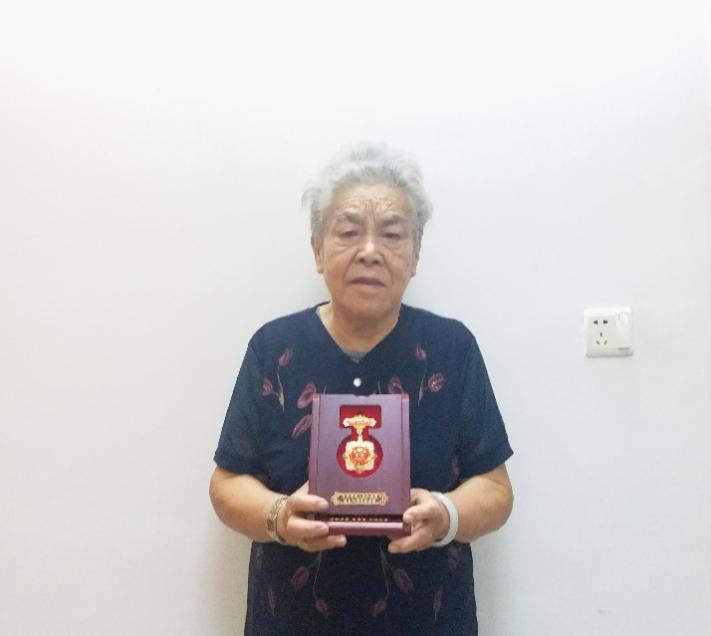 图为陈细英老人手捧纪念章