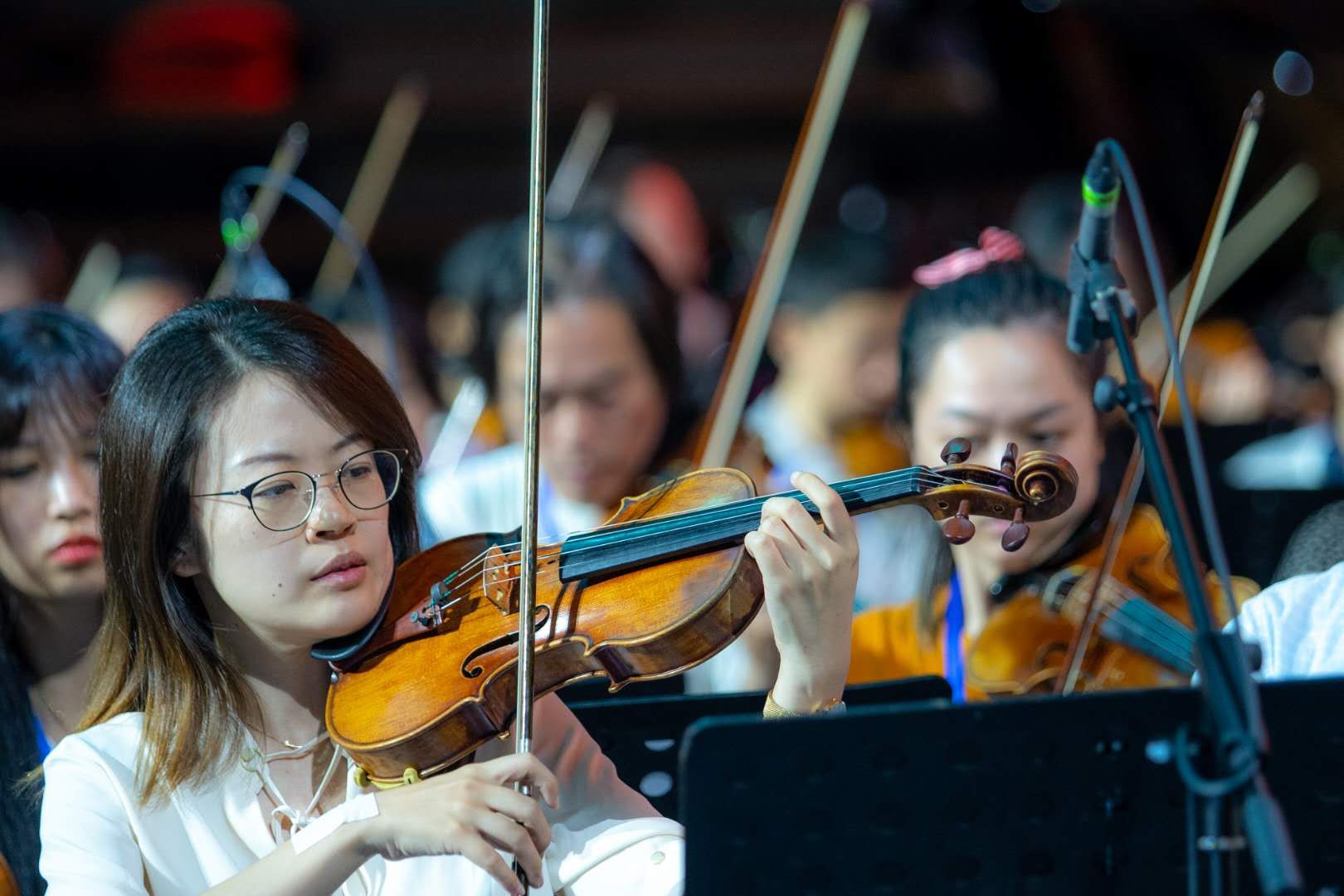 万人歌咏会上,新澳门六合彩 师生在舞台上大展异彩。音乐学院院长邹跃飞领衔,担任整场歌咏会的艺术总监。他还是现场百人乐队指挥,豪情满怀,用精准的挥拍带领全场高歌颂中华。