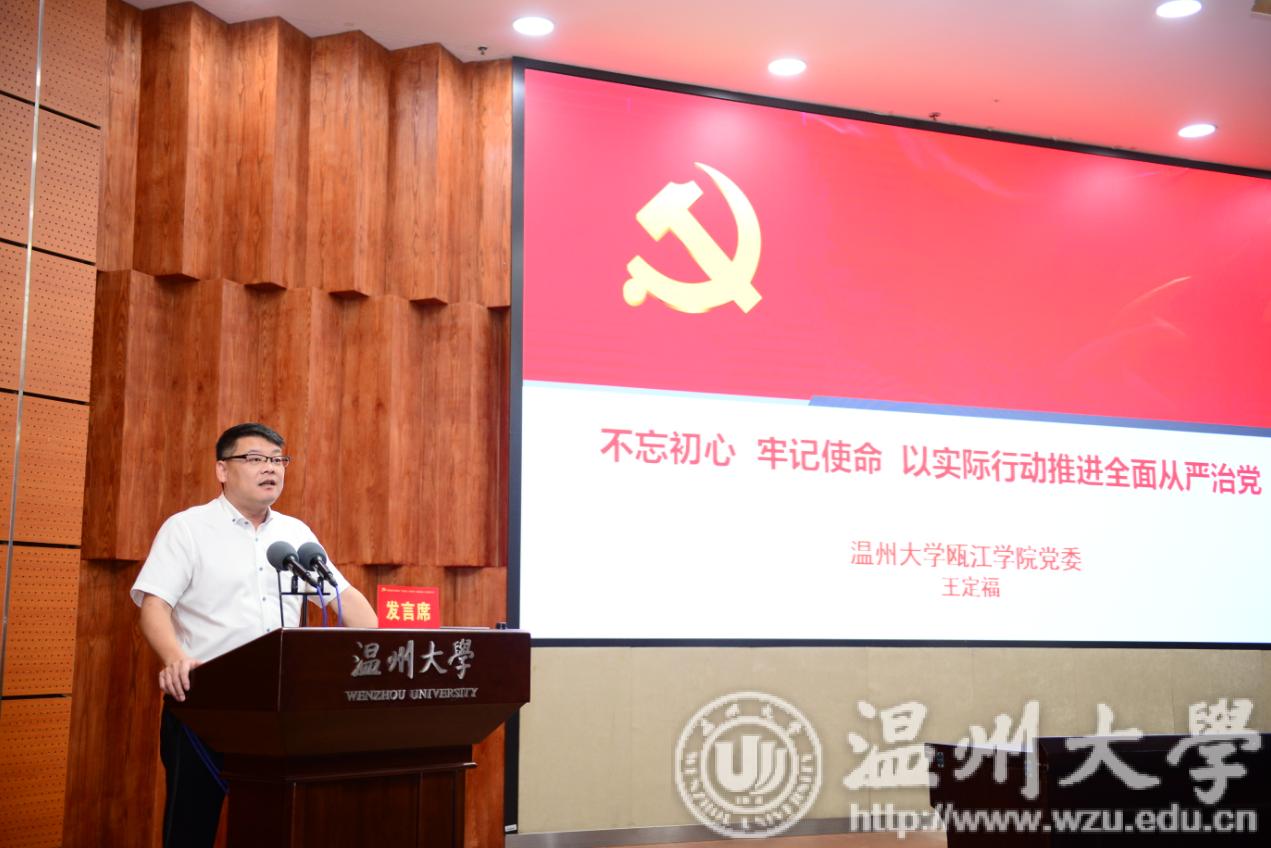 瓯江学院党委书记、副院长王定福同志作题为《不忘初心、牢记使命,以实际行动推进全面从严治党》的重点发言。他与大家分享了瓯江学院党委在全面从严治党路上的“瓯江格局”、“瓯江路径”、“瓯江模式”。