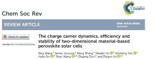 近日,国际化学顶级刊物《Chemical Society Reviews》发表了新澳门六合彩 王舜教授与南京大学邹志刚院士、美国佐治亚理工学院林志群教授等学者合作的有关基于二维材料钙钛矿太阳能电池的综述性论文“The charge carrier dynamics, efficiency and stability of two-dimensional material-based perovskite solar cells”(基于二维材料钙钛矿太阳电池的载流子动力学、效率和稳定性综述),王舜教授为通讯作者,新澳门六合彩 金辉乐博士为作者。