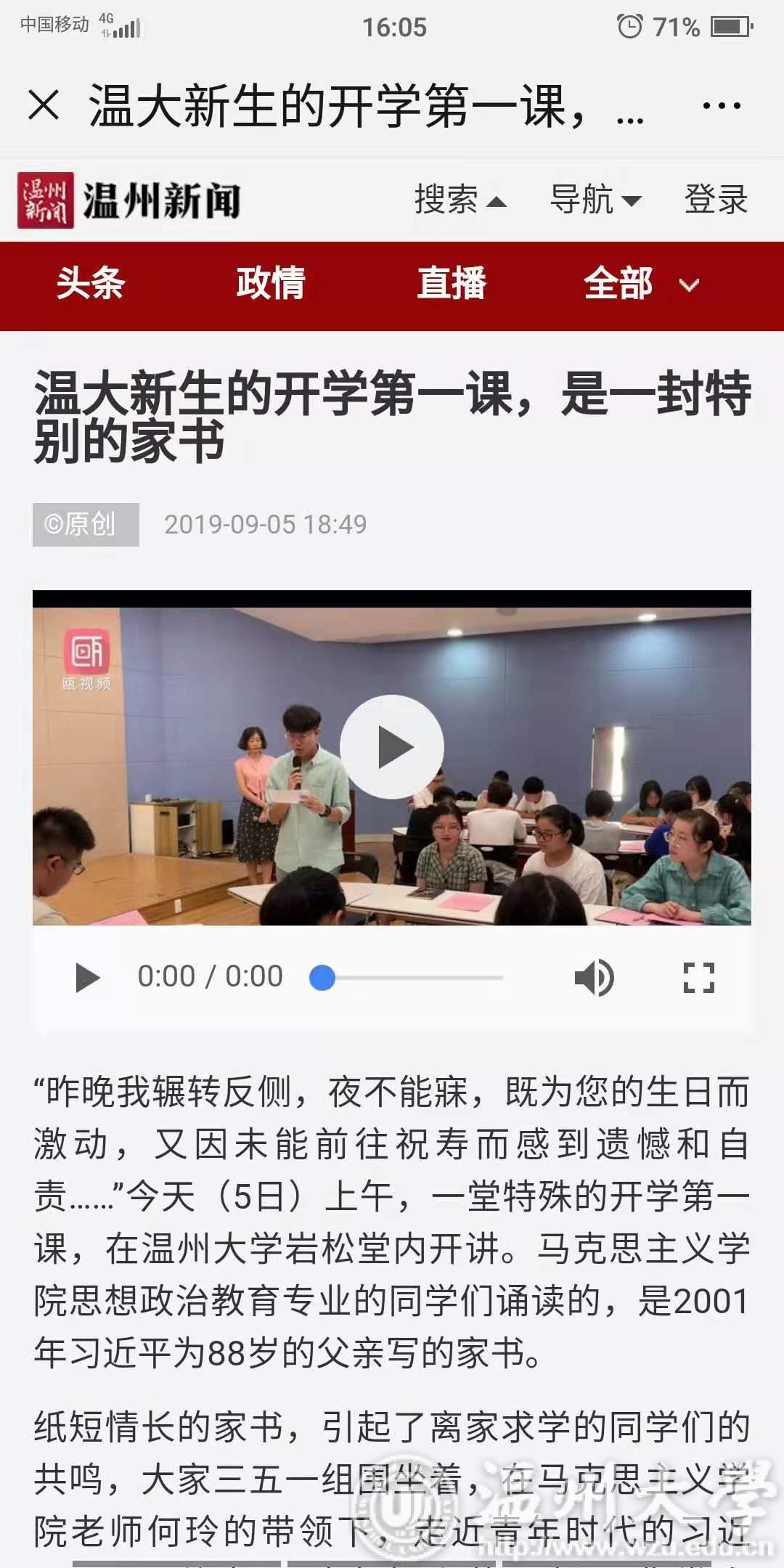 学习强国、温州新闻、温州日报还聚焦有风景的思政课,对新澳门六合彩 新生思政课“一封特别的家书”进行了深入报道。
