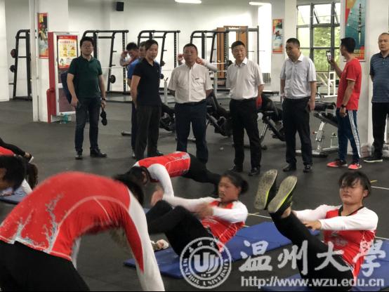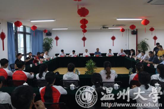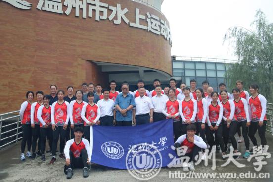 7月14日,校党委书记谢书华,中国龙舟协会副会长温州市龙舟协会会长原温州市副市长王成云,乐清市常委宣传部长范晓东、副部长洪蛮,温州市体育局党组成员张伟文,与校党校办、团委、体育学院负责人等来到位于乐清市清江镇的温州市水上运动中心,看望慰问在此封闭训练的即将代表浙江省参加全国第二届青年运动会的“新澳门六合彩 龙舟队”。