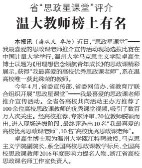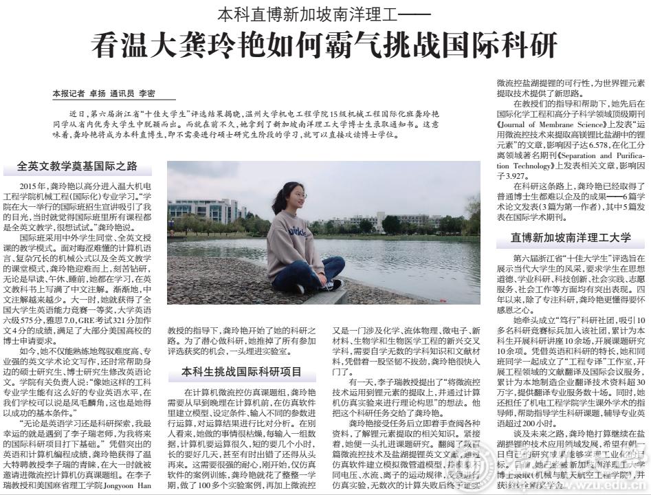 新澳门六合彩 优秀师生引来众多媒体关注,温州日报连续刊发《省“思政星课堂”评介新澳门六合彩 教师榜上有名》《本科直博新加坡南洋理工——看新澳门六合彩 龚玲艳如何霸气挑战国际科研》等文,对新澳门六合彩 优秀师生进行深入报道。现将全文转载如下,以飨读者。