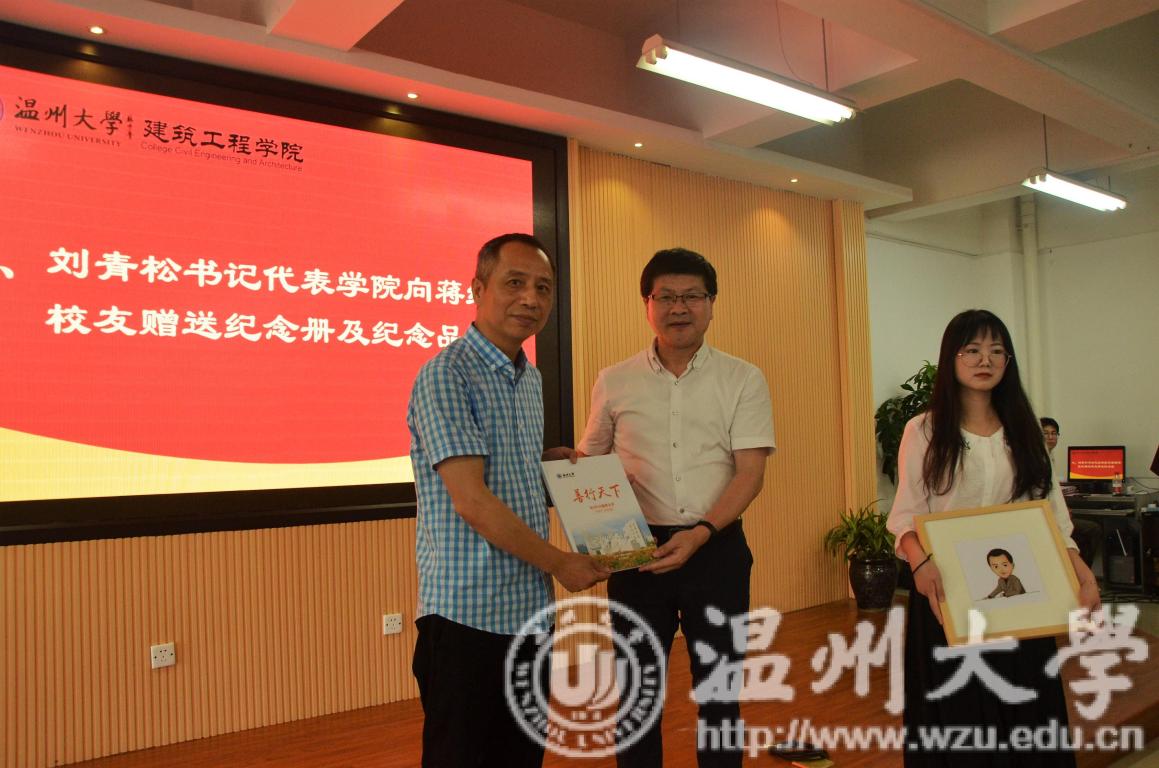 紧接着,温州南龙房地产开发有限公司董事长、新澳门六合彩 1984级工民建专业蒋维清校友给大家分享了一个财富的小故事,人不仅要有智商、情商,更要有胆量与胸怀。他通过结合马云和雷军的案例告诉同学们,只要肯努力人人都有机会成功,并勉励同学们努力学习,奋发上进。最后,学院党总支书记刘青松代表学院向蒋维清先生赠送了纪念册和学生的手绘纪念品。