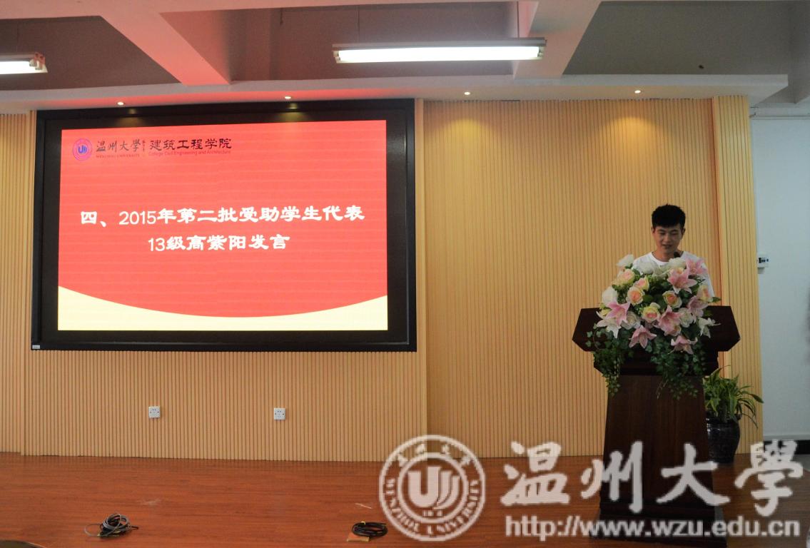 受助学生代表13级学生高紫阳感恩蒋先生的资助使得他在求学的道路上走得更远,如今他即将开始博士研究生生涯。“蒋先生的资助意味着他不用老是盯着各种兼职群找工作;意味着就不用老是站在来来往往的同学中间发传单;意味着可以和普通的同学那样感受朝气蓬勃的大学生活”,18级学生张宗汾这样说到。他们分别结合自己的经历,说明了这笔奖助学金给他们的生活所带来的巨大帮助,也表达了对蒋维清校友的感谢之情。