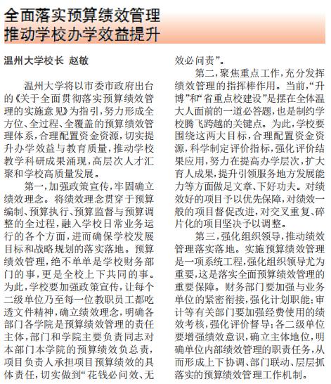5月初,我市率全省地市之先出台全面实施预算绩效管理纲领性文件——《关于全面贯彻落实预算绩效管理的实施意见》。日前,温州日报刊出校长赵敏《全面落实预算绩效管理 推动学校办学效益提升》一文,介绍学校贯彻落实全面实施预算绩效管理精神的思路。现将全文转载如下。