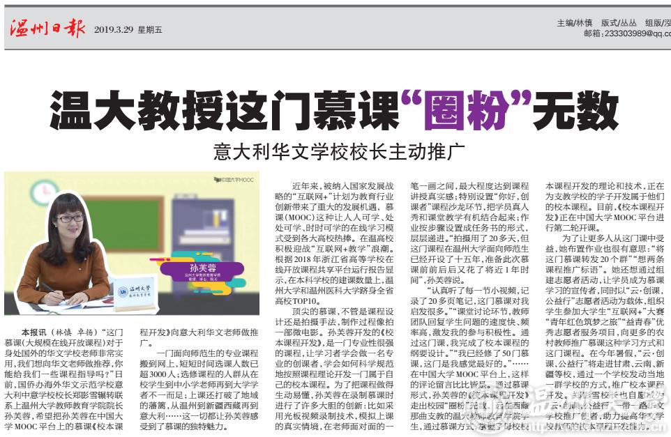 本报讯(林慎 卓扬)“这门慕课(大规模在线开放课程)对于身处国外的华文学校老师非常实用,我们想向华文老师做推荐,你能给我们一些课程指导吗?”日前,国侨办海外华文示范学校意大利中意学校校长郑影雪辗转联系上新澳门六合彩 教师教育学院院长孙芙蓉,希望把孙芙蓉在中国大学MOOC平台上的慕课《校本课程开发》向意大利华文老师做推广。