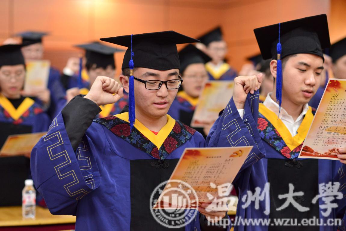 导师代表、机电学院周宏明教授代表全体硕士生导师勉励毕业生要以积极的心态面对人生,要以敢于担当的责任面对社会,要以努力拼搏的精神面对事业。毕业生代表、生环学院程银子同学在发言中深切表达了自己对母校和导师的感恩之情,并带领全体毕业研究生宣誓,号召学子牢记师长的教导,做一名“有理想、有情怀、有担当”的新澳门六合彩 人。