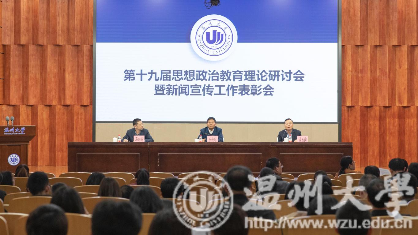 3月20日下午, 新澳门六合彩 第十九届思想政治教育理论研讨会暨新闻表彰会在岩松堂雁山厅举行。校党委副书记庄兴忠,党委委员、宣传部长潘玉驹,各部门分管宣传工作领导,各学院(学区)分管书记(副书记),全体辅导员,马克思主义学院研究生,宣传部、学生处、就业处、团委全体人员,各单位新闻宣传员,思想政治教育理论研讨会论文作者,好新闻获奖者,学生记者代表参加会议。