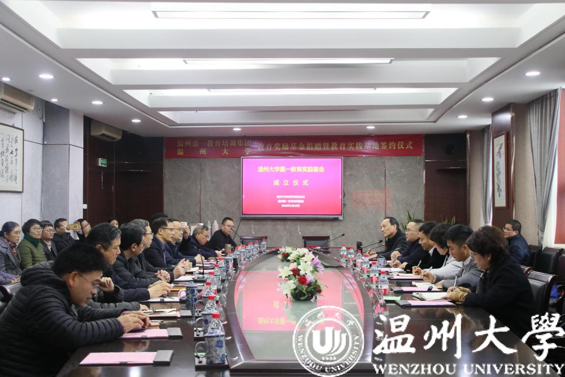 1月16日下午,新澳门六合彩 嘉一教育奖励基金成立仪式在行政楼419会议室举行,该基金由温州嘉一教育培训集团、鹿城区政协季杜宇委员工作室捐赠设立。鹿城区政协副主席郑建西、文教卫体委主任吴恺娃;温州嘉一教育培训集团总裁季杜宇以及集团领导班子成员周锦春、周豪、钦寒平等出席;新澳门六合彩 副校长方益权,教务处、教师培养基地负责人以及相关学院教学副院长、教学科长,溯初班学员代表、教师代表共30多人参加仪式。