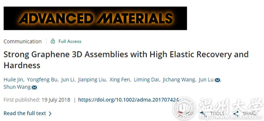 最近,新澳门六合彩 化学与材料工程王舜课题组金辉乐博士在三维石墨烯方向取得研究新进展,研究成果以“Strong Graphene 3D Assemblies with High Elastic Recovery and Hardness”为题在线发表于《先进材料》(Advanced Material,2018,DOI: 10.1002/adma.201707424,影响因子21.95)。