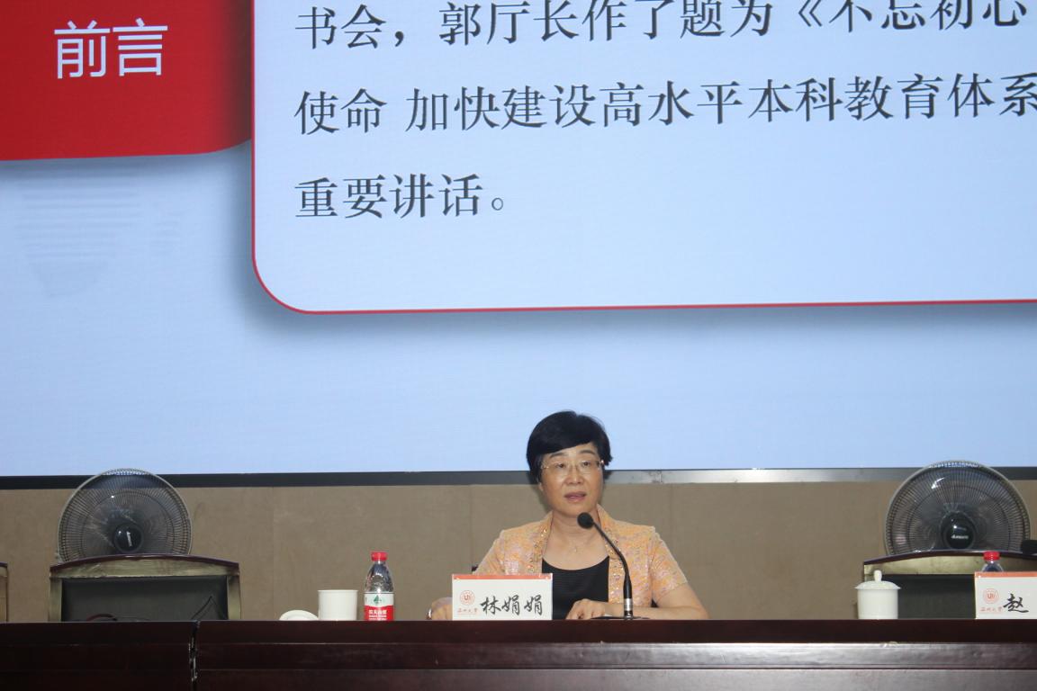 林娟娟讲话。她指出今年的思政工作研讨会既是例会,也是立足新时代,着眼新目标,全面开启学校思想政治工作新征程的动员会、部署会。与会人员聚焦立德树人根本任务,总结工作、交流经验、分析形势、强化认识、明确目标,全力推进学校思想政治工作质量提升,充分体现了新澳门六合彩 思政战线工作者的政治担当和职业操守。她着重传达了今年暑期全省本科高校党委书记校长读书会上郭华巍厅长的重要讲话精神,并就全面贯彻落实全国全省思政工作会议精神,进一步提升思政工作质量,提出新的希望、新的要求。她指出提升学校思政工作质量,必须牢牢把握“三个根本”问题。一是做好思政工作,必须肩负时代使命,狠抓立德树人,以全面坚持社会主义办学方向为根本遵循。为此,需抓住“四个着力点”:即力抓马克思主义理论教育、力践社会主义核心价值观、力行人才培养教育职能、力促大学校园和谐稳定。二是做好思政工作,必须健全体制机制,优化协同联动,以全盘构建人才培养的大思政体系为根本方向。为此,需着眼“五项工作”:即着眼思政课程和课程思政建设,畅通思政教育主渠道;着眼文化校园建设,唱响思政教育主旋律;着眼师德师风建设,铸强思政教育主心骨;着眼管理服务育人,坚定思政教育主阵地;着眼方式方法创新,把握思政教育主动权。三是做好思政工作,必须提升党建质量,强化政治引领,以全力加强党的全面领导为根本保证。为此,需做好“四个加强”:即加强学校党委领导责任,做到“高站位”;加强基层党组织政治功能,做到“俯下身”;加强党支部战斗堡垒作用,做到“立得稳”;加强思政干部队伍政治素质,做到“拿得起”。