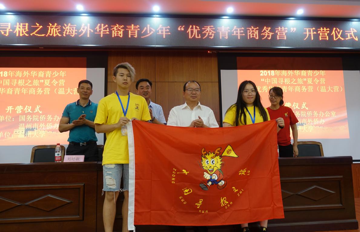 温州市侨办副主任朱玉贵先生为2018年“中国寻根之旅”夏令营“相约温州营”优秀华裔青年商务营授旗,由郑天豪和丁冰冰两位营员共同来接旗。