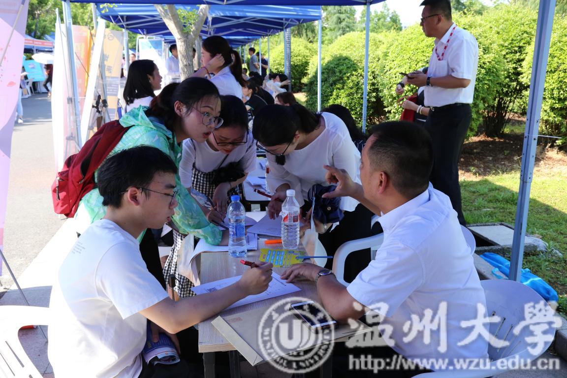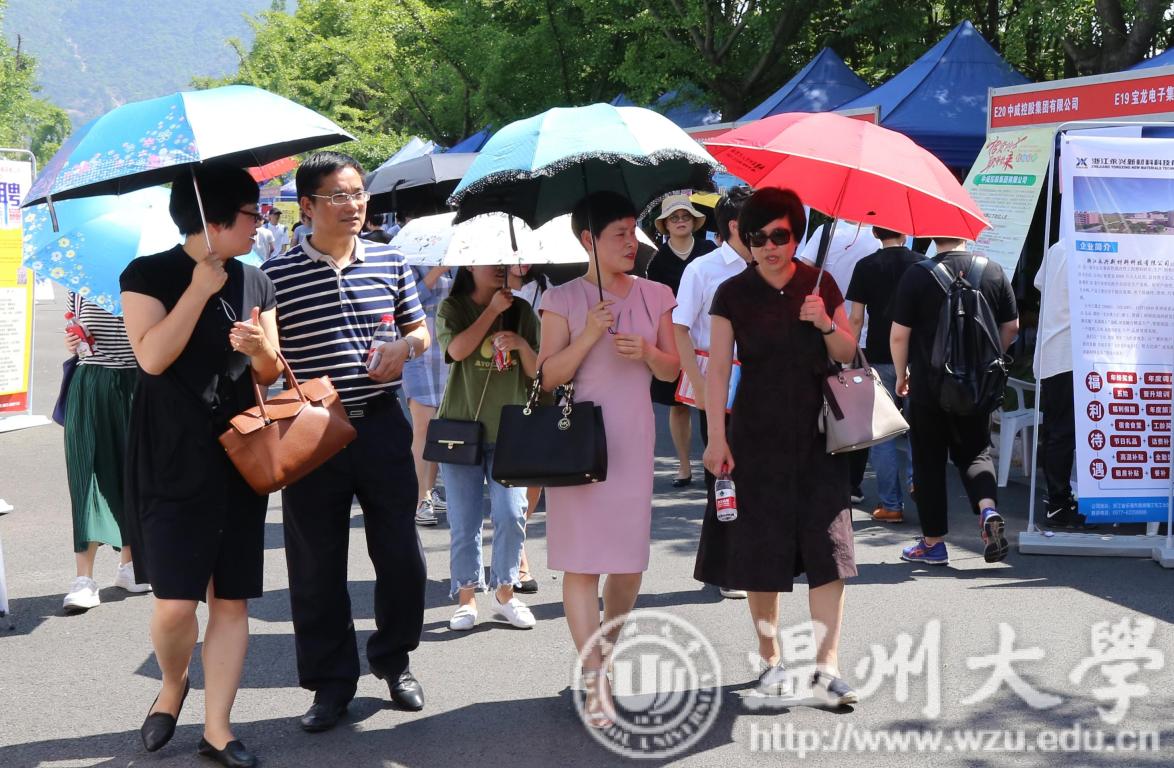 炎热高温不期而遇,企业求贤热情不减。本次招聘会,参会单位达600余家,提供就业岗位12000多个,涵盖所有专业,其中“世界500强”、“中国民营企业500强” 、“浙江省百强企业”、上市公司和行业龙头骨干企业150多家。行业分布为制造行业占29%;教育行业占14%;金融行业占5%;其他行业如科学研究、软件和信息技术服务、房地产和建筑业企业等占52%。招聘会设综合类专区、教育专区、地方专区、校友企业专区以及温州市女企业家协会企业专区等。3000余名学生参会应聘,现场达成初步就业、实习实训意向约1500人。时值新澳门六合彩 喜迎85周年校庆,100余家校友企业来校招聘学弟学妹成了一道亮丽风景。