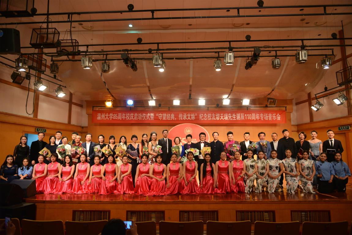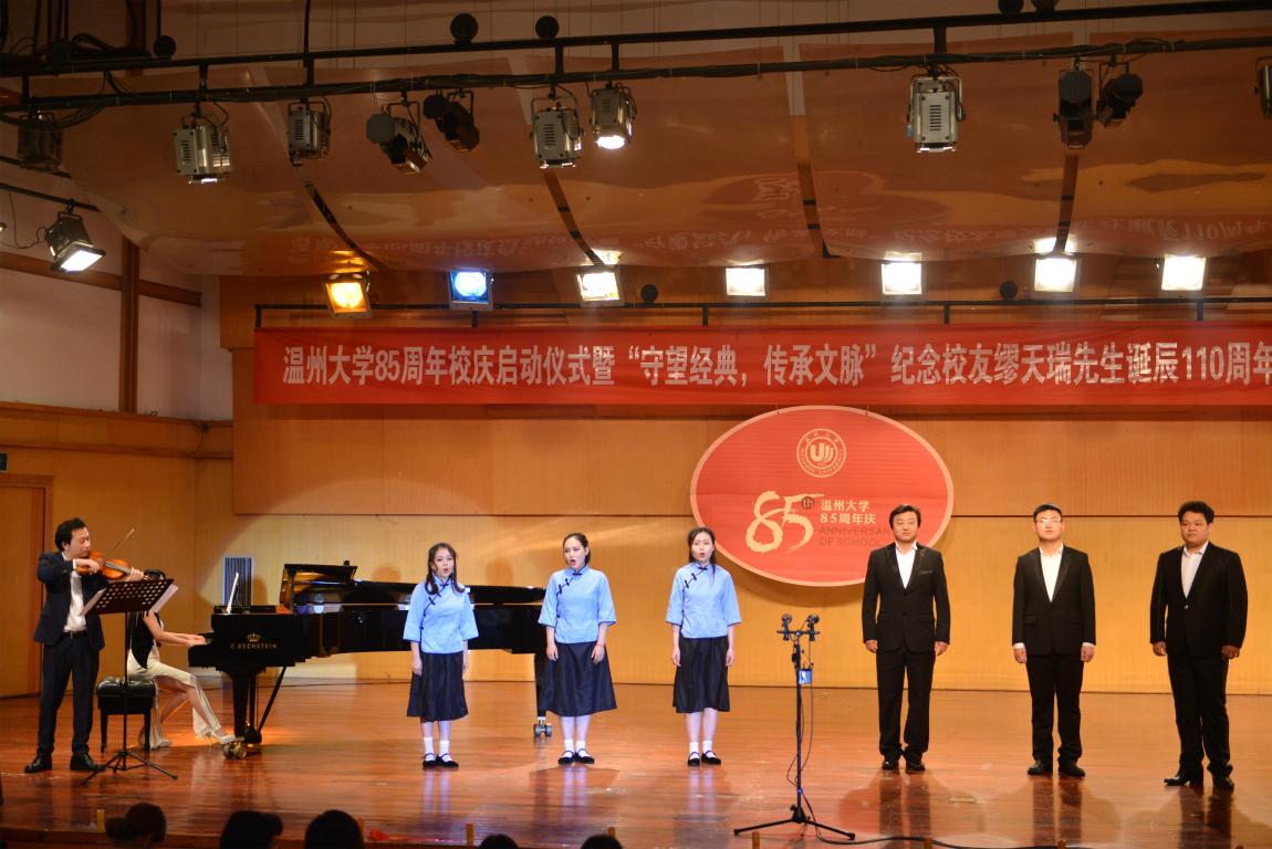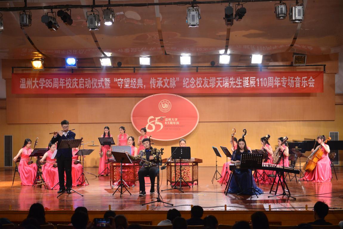 4月18日晚,新澳门六合彩 天瑞音乐厅座无虚席,在二胡协奏曲《一枝花》中,纪念新澳门六合彩 85周年庆启动仪式暨“守望经典,传承文脉”纪念缪天瑞先生诞辰110周年音乐会举行。校党委书记林娟娟、副校长钱强,温州市原社会科学联合会副主席洪振宁教授、瑞安市委宣传部部长叶艳、缪天瑞先生女儿缪斐慈女士等出席音乐会。
