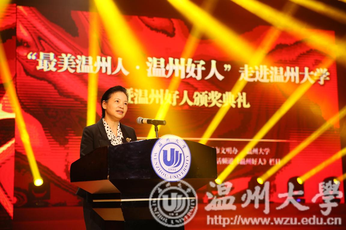 “温州是温暖之城是全国文明城市,‘大爱’是温州的标志。”校党委书记林娟娟致辞,她说,学校办学八十五年来,一代代新澳门六合彩 人始终秉持“光大国族 造福人群”的精神,生动诠释着社会主义核心价值观,展现新澳门六合彩 人崇高的责任担当与深切的大爱情怀。林娟娟指出,进入新时代迈开新征程,践行社会主义核心价值观弘扬主旋律是时代赋予青年学子的责任和当担。她表示,学校将以“爱温州,做温州好人”的主人翁姿态,积极主动参与温州全国文明城市建设;以“温州好人”进新澳门六合彩 活动为契机,进一步把温州好人的模范事迹推向广大师生学习,进一步将校园志愿者活动做强做大。