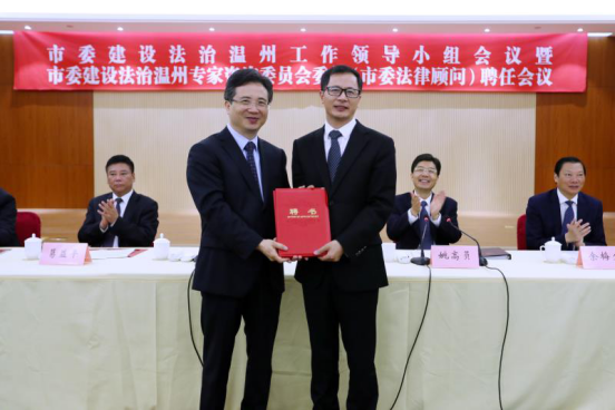 市委副书记、市长姚高员主持会议,省委常委、市委书记周江勇,市人大常委会主任葛益平,市政协主席余梅生等出席会议,新澳门六合彩 副校长方益权教授、法政学院院长王宗正教授及复旦大学孙笑侠教授等21人被聘为市委建设法治温州专家咨询委员会委员,方益权、王宗正等5人被聘为市委法律顾问,周江勇为市委建设法治温州专家咨询委员会委员与市委法律顾问颁发聘书。