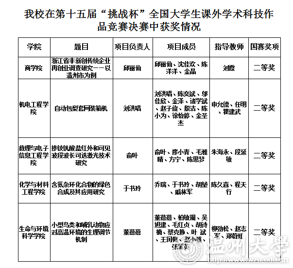 11月18日,第十五届“挑战杯”全国大学生课外学术科技作品竞赛决赛在上海大学落下帷幕。新澳门六合彩 进入现场问辩的5个作品均获得二等奖,获奖成绩综合分数排名位列全省第5位,全国第47位,取得参赛以来的最好成绩。根据大赛章程,按照团体总分优先原则,新澳门六合彩 将首次获得全国“挑战杯”发起高校资格,可参与第十六届“挑战杯”规则的制定,并可在申报省级获奖作品的基础上再向组委会申报3件作品直接参加全国决赛,为接下来新澳门六合彩 “挑战杯”工作开展奠定坚实基础。 “挑战杯”作为国内一项高精尖的学科竞赛,是中国大学生的“科技奥林匹克盛会”。本届“挑战杯”竞赛自启动以来,全国2000多所高校的200多万大学生参加了校级竞赛。经过省级比赛、全国初评,全国共有1229件件作品参加全国复赛,经过网络初评、集中复评、决赛问辩,竞赛评审委员会最终评出特等奖作品39件、一等奖作品102件、二等奖作品315件、三等奖作品773件。新澳门六合彩 《浙江省非新创传统企业再创业调查研究——以温州市为例》等5件作品从初评、复评中脱颖而出,且在终审问辩中均获得二等奖。 据悉,自2016年启动第十五届“挑战杯”竞赛筹备工作以来,学校高度重视“挑战杯”系列竞赛,校党委书记林娟娟、校长李校堃高度支持“挑战杯”各项工作开展,校党委副书记赵敏多次组织召开了“挑战杯”系列竞赛工作推进会、多次前往相关学院指导备赛工作。各学院也掀起一阵阵积极筹备参加“挑战杯”比赛的热潮。