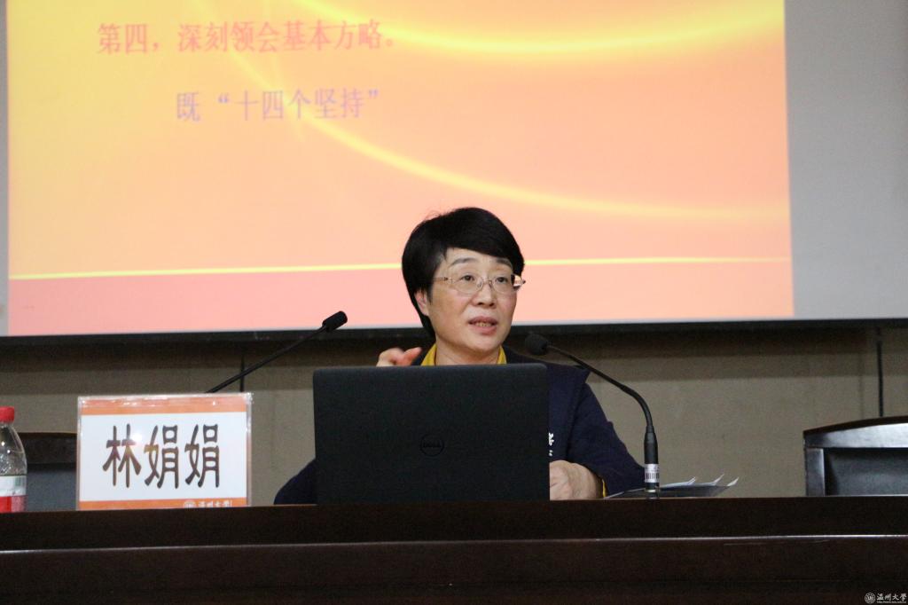 林娟娟从党的十九大报告的主题、习近平新时代中国特色社会主义思想、过去5年的历史性成就和历史性变革、中国特色社会主义进入新时代和新时代党的历史使命、我国社会主要矛盾的变化、两个一百年奋斗目标的战略部署、我国经济社会发展重大战略部署、坚定不移推进全面从严治党等八个方面全面解读了党的十九大精神。她指出,党的十九大是在全面建成小康社会决胜阶段、中国特色社会主义进入新时代的关键时期召开的一次十分重要的大会,学习党的十九大精神首先要透彻理解党的十九大主题,不忘初心,方得始终,牢记共产党人的使命,为中华民族伟大复兴的中国梦不懈奋斗。习近平新时代中国特色社会主义思想是马克思主义中国化的最新成果,是党和人民实践经验和集体智慧的结晶,学习习近平新时代中国特色社会主义思想,要深刻领会其历史地位和重大意义,深刻领会其丰富内涵与基本方略,深刻领会其重大历史贡献与长远指导意义。