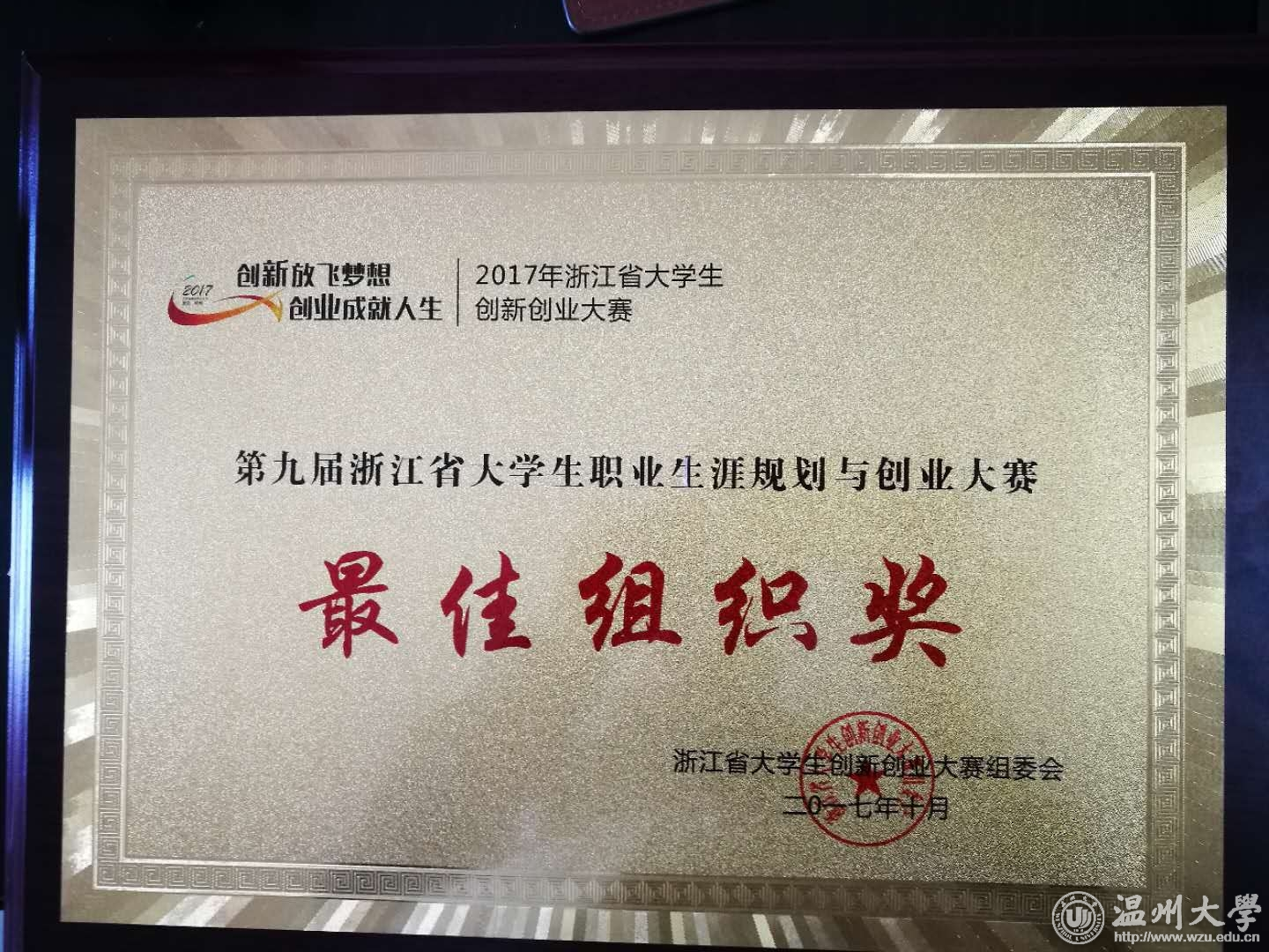 浙江省职业规划与创业大赛是省一级学科竞赛。大赛2017年4月启动, 全省102所高校2.1万大学生参加本次赛事, 640个项目进入省级复赛,最后 162个项目进入总决赛。其中,新澳门六合彩 法政学院郑荣权同学参赛项目《在黑暗中追逐光明》以总分第一的成绩获得职业规划类一等奖,并荣获“2017年浙江省最佳职业规划之星”称号;教师教育学院周群慧团队参赛项目《知心童行》以总分第一的成绩获得创业实践类一等奖;机电工程学院屠佳炜团队参赛项目《银装数果》以总分第二的成绩获得创新创意类一等奖;物理与电子信息工程学院陈铮团队参赛项目《温州唐天娱乐传媒有限公司》获得创业实践类一等奖;建筑工程学院杨璐团队参赛项目《精细化三轴试验配套装置研发与推广》获得创新创意类二等奖。孙德升、严晓秋、姜锐、林爱菊、彭小媚等11名老师荣获“浙江省第九届大学生职业生涯规划与创业大赛优秀指导师”称号。