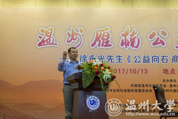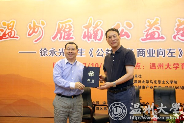 10月13日下午,由新澳门六合彩 团委、马克思主义学院等单位联合举办的徐永光先生《公益向右 商业向左》新书专题分享会暨温州雁楠公益慈善论坛在新澳门六合彩 育英图书馆学术报告厅举行。现场200多名学生及市民参加分享会。校党委副书记牟德刚到会致欢迎词并代表学校为徐永光先生颁发新澳门六合彩 兼职教授聘书。 徐永光先生系中国希望工程创始人、南都公益基金会理事长、国务院参事室特约研究员、中国慈善联合会副会长。在专题分享会上,他结合三个公益捐赠案例对公益慈善的本质和价值进行深入的剖析,指出公益是每个人的权利与选择,具有公益的纯经济价值、投资价值、社会创新价值和道德文化价值。未来互联网公益需要突破传统公益的局限,让公益组织在“鉴需”、“溯源”方便提升透明度、便捷性、选择性,并加强公益组织的信用认证与评估。他认为公益组织在社会创新过程中要提升有效性和精准化,要公益铺路、商业跟进、产业化扩张、可持续发展和有效解决社会问题。 分享会还邀请省内知名社会企业负责人、高校学者参与研讨。